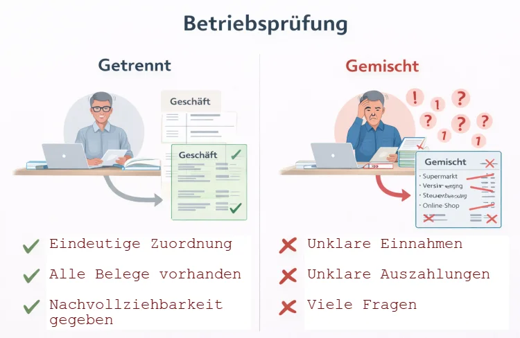 Viele Selbstständige starten pragmatisch: ein Konto, alle Einnahmen, alle Ausgaben. Die private Miete läuft darüber, genauso wie die Rechnung eines Kunden. Anfangs wirkt das unkompliziert. Doch spätestens mit steigenden Umsätzen, ersten Steuervorauszahlungen oder einer Betriebsprüfung wird aus dieser Bequemlichkeit schnell ein Risiko.